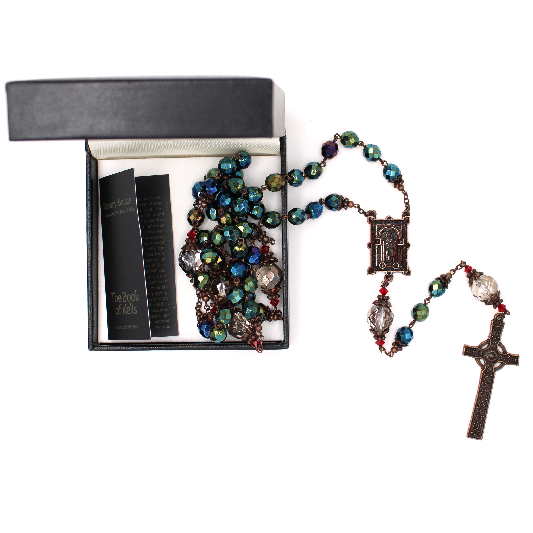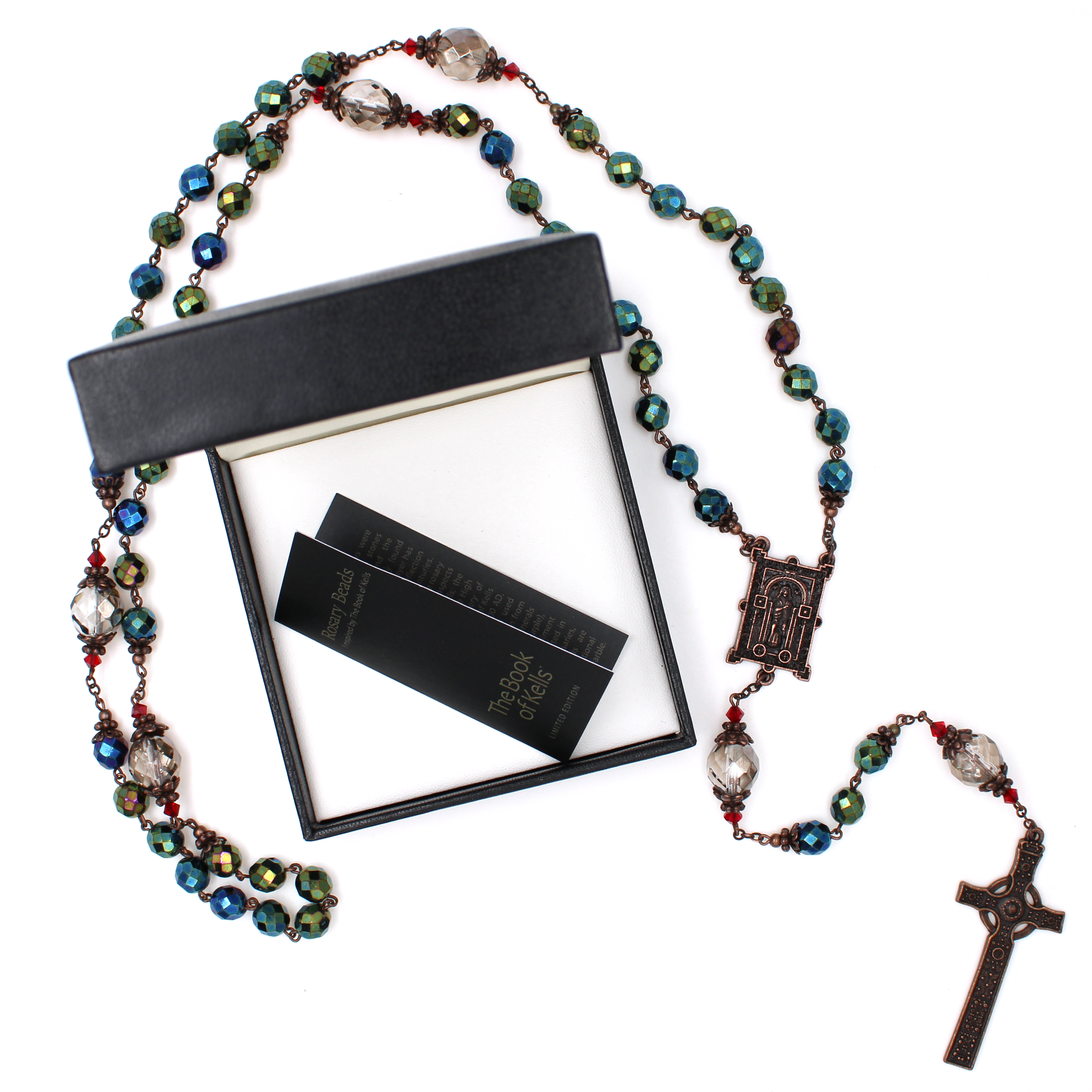 Immerse yourself in the rich symbolism of Celtic heritage with the Book of Kells Green and Bronze Rosary. The vibrant green beads, reminiscent of lush landscapes, are complemented by intricately detailed bronze Celtic knots. This beautifully crafted rosary invites reflection on the eternal nature of life, while the Celtic-inspired crucifix serves as a powerful symbol of faith. Embrace the fusion of nature and spirituality with this unique rosary that echoes the artistic brilliance of the Book of Kells.