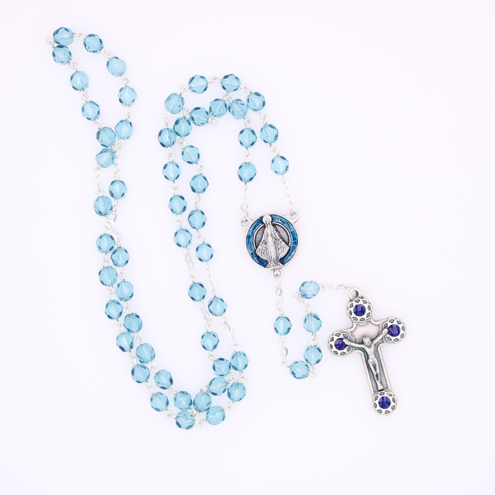 6mm Firepolished Blue Topaz Rosary with Miraculous Center and Matching Crucifix